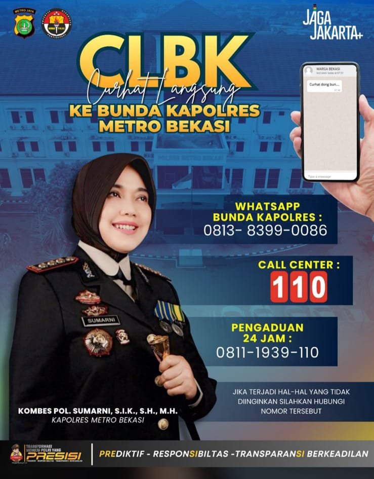 Kapolres Metro Bekasi, Kombes Pol. Sumarni, S.I.K., S.H., M.H., menyampaikan bahwa layanan CLBK bertujuan memangkas jarak antara masyarakat dan pimpinan kepolisian. Warga dapat menyampaikan aduan melalui WhatsApp Bunda Kapolres di nomor 0813-8399-0086, Call Center Polri 110, serta nomor pengaduan 24 jam 0811-1939-110.