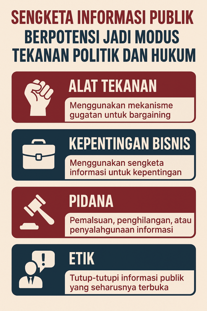 Sengketa informasi publik yang pada dasarnya menjadi instrumen transparansi dan akuntabilitas, ternyata memiliki potensi untuk disalahgunakan. Beberapa kalangan menilai, mekanisme ini kerap dijadikan modus oleh pihak-pihak tertentu untuk kepentingan politik maupun ekonomi.